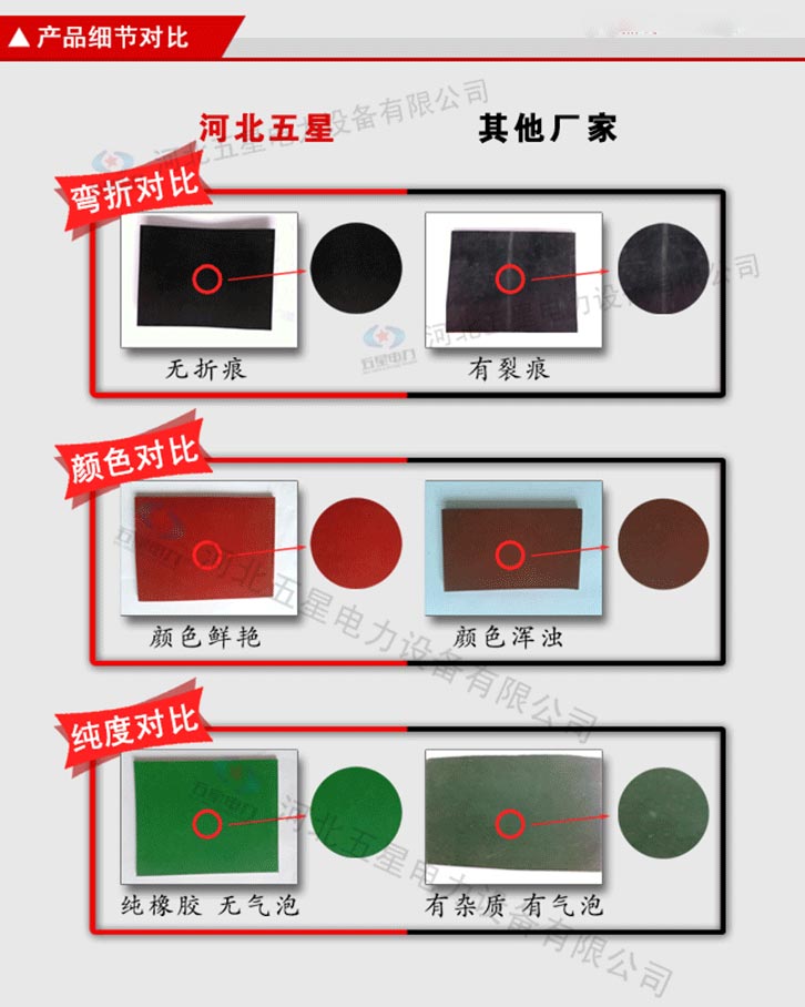 絕緣膠墊產(chǎn)品顏色為黑色、紅色、綠色。 不含雜質(zhì):原生橡膠材質(zhì),不含次生膠,切面不會有粉末 柔韌性好:具有優(yōu)良的絕緣性能,彈性強,拉伸強度大 光澤度高:原生橡膠材質(zhì),無任何塑料成分,表面光澤度高 無氣泡:五星電力絕緣膠墊,表面無氣泡,無裂痕